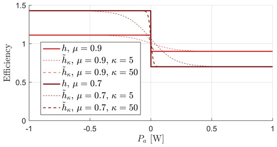Define the efficiency function, so that . Consistently with Equation (16), h is equal to for positive , and for negative , as illustrated in Figure 1. Such a discontinuous function is undesirable for the efficient implementation of the spectral control approach, detailed in Section 2, and which requires the explicit calculation of the 1st- and 2nd-order derivatives of the objective function. Therefore, in this work, is approximated by the following function,