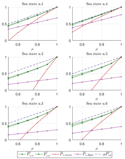 Figure 2 shows control results obtained with the WECCCOMP numerical model (see Section 3.2), in the six sea states of the competition, and values of between 1 and . In each sea state, power values are normalised by , the optimal power obtained with . essentially represents the optimal absorbed mechanical power; it is a well-known theoretical limit in the wave energy literature [1], which can be calculated as . As per Equation (19), and together provide bounds to , the optimal power for the exact efficiency function.