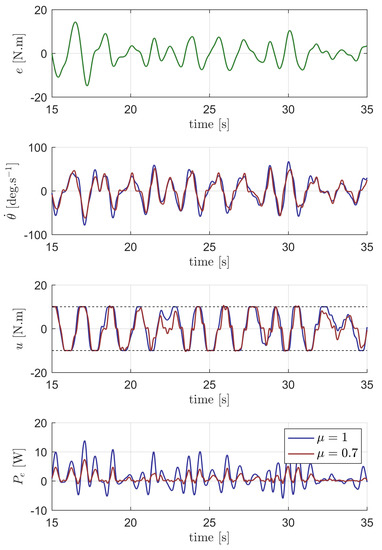 Reactive control techniques (which imply that, at times, is negative) are essential to achieve optimal or near-optimal hydrodynamic power absorption, when the incoming wave frequency is away from the system’s resonant frequency. In the case of monochromatic waves, a simple PI control law, of the form , can achieve optimal power absorption, following the principle of impedance matching [1]. In irregular waves, a PI control law also presents significant improvements in absorbed power, with respect to a passive law of the form , although the PI controller is then sub-optimal. A salient point of studies [11,12] is that reactive control is particularly affected by a non-ideal PTO efficiency. In particular, it appears that the smaller is, the less reactive control should be performed (i.e., should be smaller).