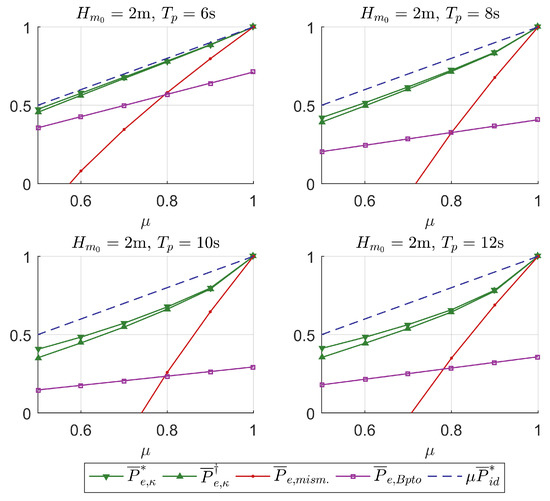 Also shown in Figure 2, the dotted lines labelled “” represent the upper bound of Equation (20), i.e., a hypothetical scenario where would “only” be affected by a factor of . is the actual electric power which would be obtained, if the solution to the ideal control problem were followed by a WEC with imperfect PTO efficiency ; in other words, shows the effect of a mismatch between the nominal efficiency () and the actual efficiency (). Finally, represents the power obtained using a simple linear PTO damping, with coefficient optimised for each sea state.