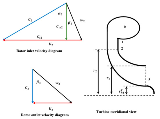 For the velocity triangle with the flow entering the rotor at negative flow angle , the negative incident angle is shown in Figure 1. Considering design point conditions when the flow exits the turbine axially, the Euler equation for the turbine is reduced to: