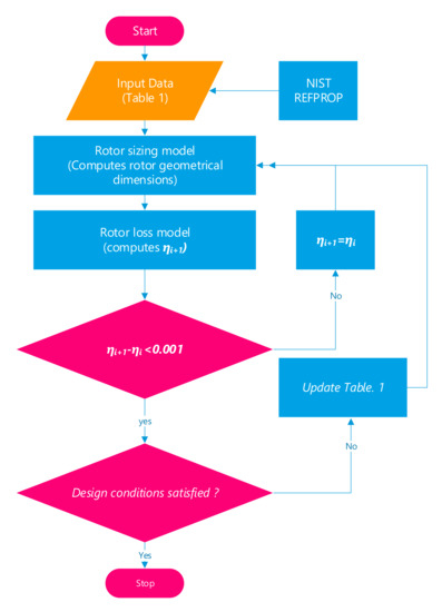 The rotor loss model [23] presented in the current section was used to compute the different types of enthalpy losses occurring while the flow expands in the turbine rotor. The rotor loss model presented in the current section was used to compute the updated value of efficiency based on Equations (28) and (29), whereas efficiency used in the first iteration had an assumed value. Thus, this procedure was recalculated between the rotor sizing model and rotor loss model until efficiency values converged. The flow diagram of the process is shown in Figure 2.