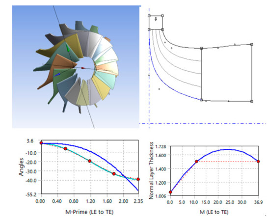 Optimized geometry computed through meanline design calculations and response surface optimization was constructed using the ANSYS-blade editor. Figure 6 shows the 3D model of the turbine geometry along with the meridional view and distribution of blade angles and blade thickness with streamline direction.