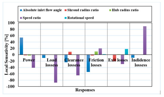 As discussed in the above section, the five design variables, i.e., rotational speed (), total to static speed ratio (, hub radius ratio (, shroud radius ratio ( and inlet flow angle ( were considered for the optimization process. The lower and upper limits of the design variables are given in Table 3. In addition, various designs computed using the central composite design are given in Table 2. Sensitivity results based on the soled regression model given by Equation (42), for the design variables, i.e., rotational speed (), total to static speed ratio (, hub radius ratio (, shroud radius ratio ( and inlet flow angle ( for the response variables, i.e., power output, load losses, clearance losses, friction losses, exit losses, and incidence losses, are given in Figure 8. The results suggest that response variables are most sensitive to inlet flow angle ( and speed ratio (.