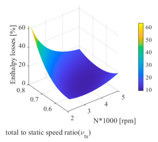 Variation of the enthalpy losses with the total to static speed ratio and rotor RPM.