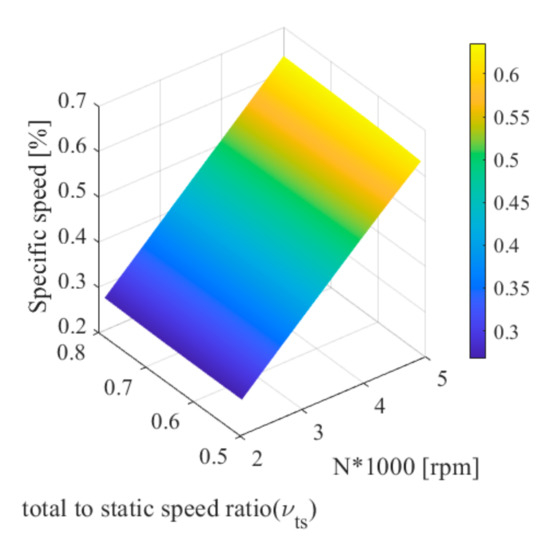 Variation of enthalpy losses with and rotational speed is shown in Figure 10. According to the figure, enthalpy losses decrease and then increase with the increase in the value of rotor’s revolutions per minute (RPM) for a given value of . Similarly, losses decrease initially and then start increasing with the increase in the value of the at a given fixed value of the . Figure 11 shows the variation of the specific speed with rotational speed and . The specific speed of the rotor increases linearly with the increase in rotor rpm, significantly. The specific speed also increases with the increase in the value of , however, its sensitivity to is smaller in comparison with its sensitivity to rotational speed.