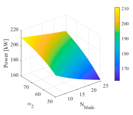 The response surface of power bounded by and the number of blades is shown in Figure 12. It can be seen that power increases linearly with the increase in . The sensitivity of power at higher values of the number of blades is higher in comparison to its sensitivity corresponding to a fewer number of blades. On the other hand, power decreases linearly by increasing the number of blades at lower values of but at higher values of the power increases initially with a slight increase in the value of the number in blades and then starts to decrease. Concerning the value of the enthalpy loss increase with the increase in the number of blades at smaller values of , but at higher values of , losses decrease slightly initially and then start increasing with the increase in the number of blades, as shown in Figure 13. Hence, enthalpy losses initially reduce with the increase in the value of and then start rising at a given value of the number of rotor blades.