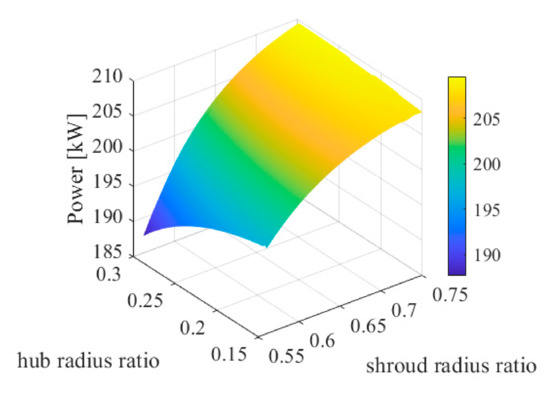 Variation of the power with shroud radius ratio and hub radius ratio.