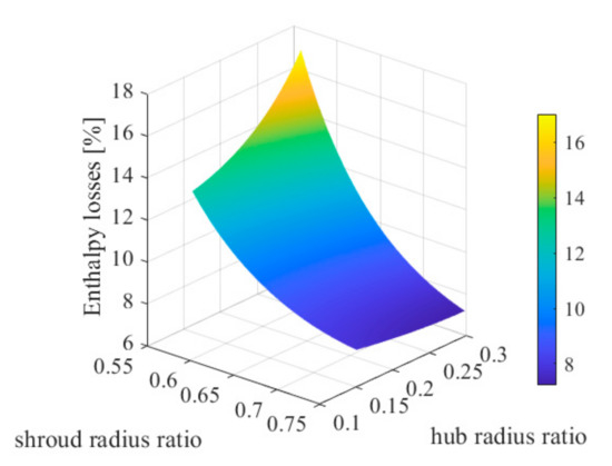Variation of the enthalpy losses with shroud radius ratio and hub radius ratio.