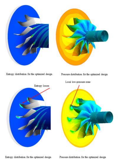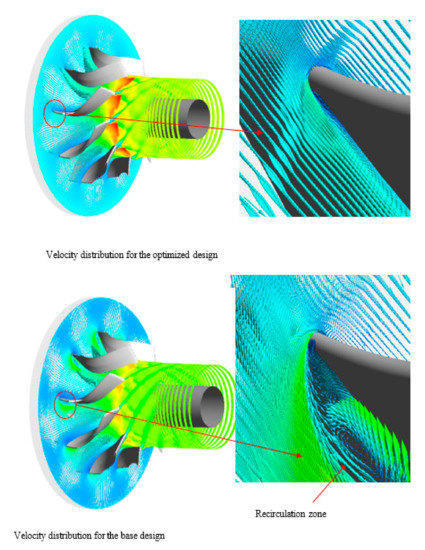 A comparison of the results for the base meanline design and the optimized design is listed in Table 4. This comparison suggests that an optimized set of parameters causes a significant improvement in the performance of the turbine rotor. For the optimized design, an improvement of 4.94% and 4.29% was observed for the power and total to static efficiency, respectively. Meanwhile, Table 5 shows the differences in the comparison between the meanline design calculations and CFD calculations.