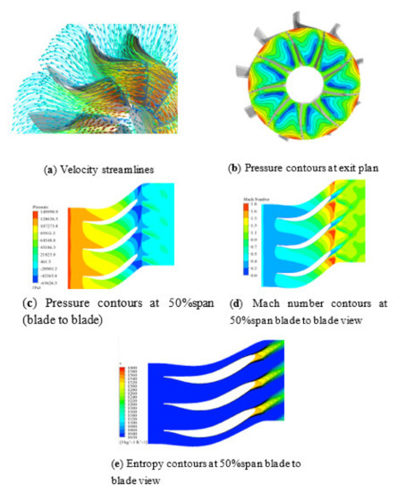 (a) Velocity streamlines in the turbine passage, (b) pressure contours at the exit plane, (c) pressure contours at 50%span (blade to blade), (d) Mach number contours at 50%span blade to blade view, (e) Entropy contours at 50%span blade to blade view.