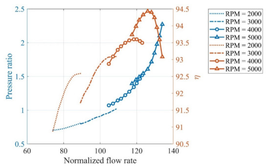 Figure 19 shows the off-design maps of the turbine. Off design maps were generated to ensure the behavior of the turbine during off-design conditions. Off-design maps showed that the behavior of the off-design conditions is appropriate and provided additional validity of the adopted process. This is based on the fact that the operational margin of the optimized turbine in the off-design conditions is sufficiently broad. It can be seen from Figure 19 that the optimized turbine can exhibit reasonable performance by altering the flow rate of the turbine by of its design point value.