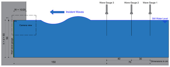 The incident and reflected waves were obtained at 1.5 m away from the vertical wall, following the method described by Zelt and Skjelbreia [49]. To this end, an array of 3 wave gauges with a sampling rate of 100 Hz were used, see their location in Figure 2. In addition, a wall wave gauge with its electrodes integrated flush in the wall (identical to wave gauges placed at wave generation paddles with ARC systems, see Figure 1c) was installed in the vertical wall, located at 12 cm away from the wave flume glass wall. This wall wave gauge had a sampling rate of 1000 Hz and was used for the measurement of the water level and the wave surface velocity at the vertical wall. All wave gauges included water conductivity compensation devices, to guarantee the accuracy of the measurements in all circumstances, correcting for temperature variations throughout the tests.