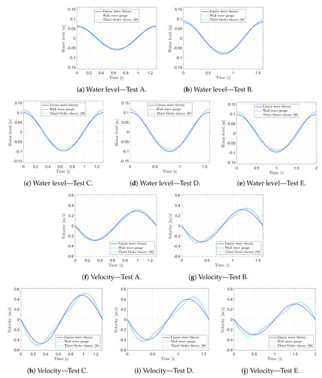 This section compares the theoretical expression for the wave impact velocity based on linear wave theory (see Section 3.1) with the measurements by the wall wave gauge in the tests without an overhang. Figure 3 show the comparison between measurements and theoretical estimations for the water level and wave surface velocity. For the theoretical estimations, a reflection coefficient of 100% () is considered. In addition to linear wave theory, the water level and wave surface velocity estimated by the third order wave theory from Reference [38] is also presented in Figure 3.