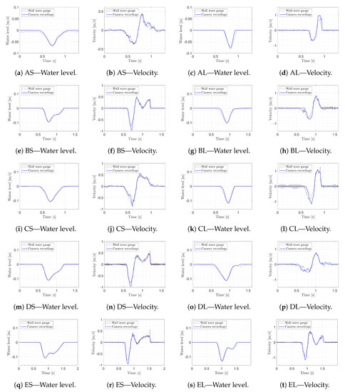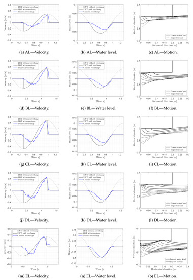 The camera recordings are used in this study to characterize the displacement of water surface before the wave impact. From each image frame from the camera recordings, the water surface was recognized. This is used to estimate the wave impact velocity and the non-uniformity of the wave surface before and during the wave impact. The water level and wave surface velocity presented hereafter are calculated as the average along the length of the overhang, 0.1 m for the shorter overhang and 0.2 m for the longer overhang. Figure 5 presents the results for the shorter overhang, while Figure 6 presents the results for the longer overhang. Table 3 summarizes the results for tests with overhangs, describing the differences between the impact velocity estimated by the linear wave theory (), with the measured maximum upward velocity (). In this study, is calculated and showed in all graphs as the value obtained at the wall position, without averaging over the overhang length. This leads to a difference of between 0.11% to 0.35% in the obtained velocities for shorter overhangs and to a difference of between 0.39% to 1.26% in the obtained velocities for longer overhangs. This method allows consistency and simplicity in this study, with impact velocities obtained from Equation (1).