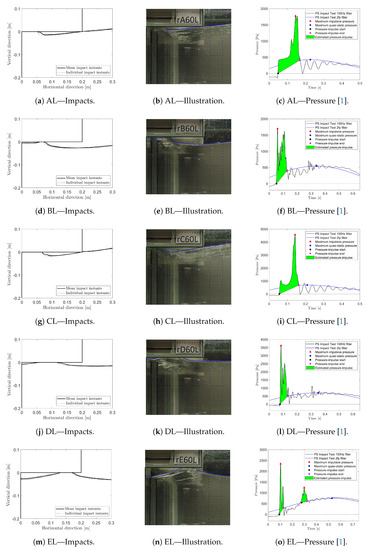 For tests with shorter overhangs, Figure 5 and Figure 7 are analysed together, considering also the six impacts types from Reference [1]. For tests AS and CS an air pocket is found directly at the wall. This is named as Type I impact, which has one single peak, an intermediate level of vibrations and an intermediate impact duration. For tests BS and DS an air pocket is found away from the wall. This is named as Type II impact, which has one single peak, almost no vibrations and an intermediate impact duration. The presence of an air pocket away from the wall is caused by a previous run-up of the wave at the wall and a first pre-impact observed in the pressure signal for tests BS and DS. For test ES, a minimum air pocket is found below the overhang. This is named as Type III impact, which has one single peak, a reduced level of vibrations and a very short impact duration. For tests with longer overhangs, Figure 6 and Figure 8 are also analysed together. For tests AL and CL an air pocket is found away from the wall. This is named as Type IV impact, which has one stepped wide peak, an intermediate level of low frequency vibrations and a very long impact duration. The presence of this air pocket away from the wall is caused by a previous run-up of the wave at the wall and a first pre-impact observed in the pressure signal for tests AL and CL. For tests BL and DL an air pocket is found directly at the wall. This is named as Type V impact, which has one peak with a close secondary peak, large vibrations and a long impact duration. For test EL, an extremely large air pocket is found below the overhang. This is named as Type VI impact, which has two peaks within an interval of 0.2 s (), an intermediate level of vibrations and an intermediate impact duration. This double impact (see Figure 6o and Figure 8o) occurs as the wave surface first hits the outer edge of the overhang, before a second pressure peak occurs when the wave surface at the wall impacts the overhang.