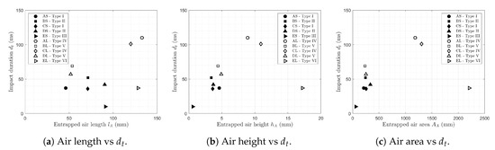 Figure 9 presents a comparison between the entrapped air dimensions (i.e., length, height and area) and the impact duration. According to these results, the increase in the entrapped air dimensions is closely related to an increase in the impact duration. This relation is caused by the compression of air during the wave impact, as it is predicted by References [2,6]. The discrepancy for the double peak EL test is explained by the fact that the impact duration is calculated as the impact duration of the first of the two pressure peaks. For the tests AL and CL with a strong pre-peak, it is important to mention that the impact duration is much longer due to this pre-peak. Nevertheless, for all the tests (besides for test EL) a rather strong correlation exists between impact duration and entrapped air dimensions. Among the entrapped air dimensions, the entrapped air height () shows the strongest correlation with the impact duration. The entrapped air area () also show a high correlation with the impact duration, while the entrapped air length () does not show any clear trend. Furthermore, Figure 9 also shows that the entrapped air height and entrapped air length are related to the overhang length (W). It is observed that for the tests with the longer overhangs, the entrapped air pockets are thicker and longer. This suggests that the overhang length may determine both the maximum entrapped air length and the maximum entrapped air height.