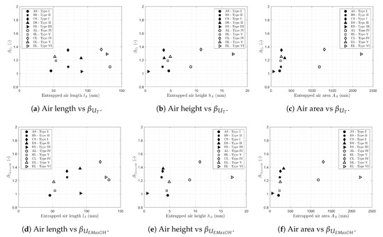 Figure 10 presents a comparison between the entrapped air dimensions (i.e., length, height and area) and the effective bounce back factor (including and ). For all cases, larger values are found for larger entrapped air dimensions. These relations highlight that the effective bounce-back factor accounts for the entrapped air dimensions, but the associated scatter also shows that is affected by other processes and uncertainties. Furthermore, this scatter in the observed trends between and entrapped air height is larger in Figure 10d/e/f for (where the impact velocity is obtained from camera recordings) than in Figure 10a/b/c for (where the impact velocity is obtained from linear wave theory). In summary, according to experiments analysed in this study, the increase in the entrapped air dimensions is linked to an increase of the variability of wave impact magnitudes, an increase of pressure/force impulses, an increase of the impact durations and a decrease of the pressure/force peaks.