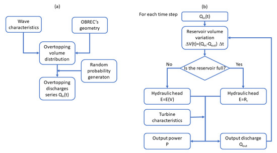 Workflow of the proposed method. (a) Overtopping discharge time series generation. (b) Output power P evaluation.