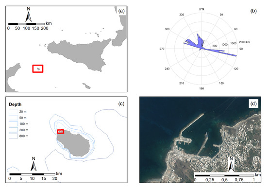 (a) Location of Pantelleria Island (Sicily, Italy). (b) Geografic fetch. (c) Location of the Port of Pantelleria. (d) Layout of the Port of Pantelleria.