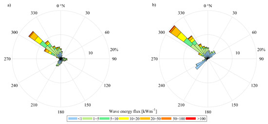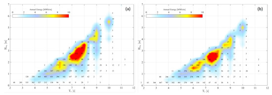 Average wave energy per unit crest length: (a) point O1; (b) point N1. The color scale represents annual energy per meter of wave front (in MWhm). The numbers within the graph indicate the occurrence of sea states (in number of hours per year).