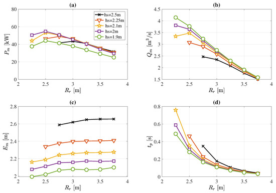 Effects of and ( and m) during the period 2013–2017 on the: (a) yearly average output power; (b) yearly average outflow rate; (c) average hydraulic head; (d) percentage of time when the reservoir is full.