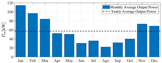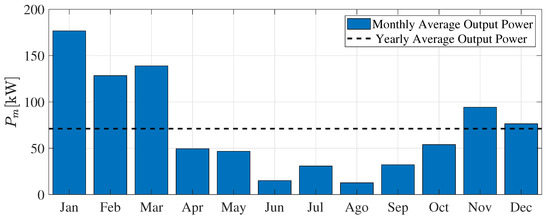 An analysis of the monthly (Figure 11) average output power of the device operating with the optimal configuration (i.e., m, m, m and ) has also been carried out.