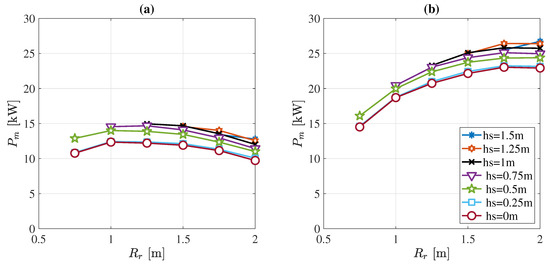 Figure 15 shows the yearly average output power versus the variation of and for a device with 50 turbines installed and with the possibility to turn on a number of turbines between 10 and 50 using blocks of 10 turbines. It can be noticed that the optimal configuration is the one with m and m.