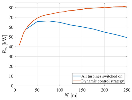 Comparison between the yearly average output power versus the variation of N in the case of the adoption of the static or the dynamic control strategy ( m, m, m and a step of 10 in the choice of the number of open turbines).