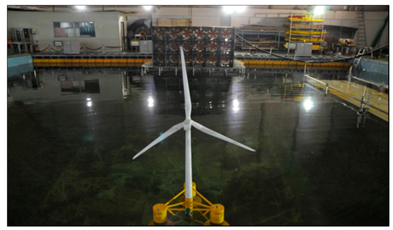 The scaled model test of the OC4 semi-submersible model was carried out at the UOU’s water tank, as can be seen in Figure 2. The water tank has a water depth of 2.5 m, is 30 m in length, and is 20 m in width. In a floating offshore wind turbine model test, the dominant forces are in hydrodynamic loads, including viscous force, gravity, inertia, and aerodynamic wind force. Froude number is the ratio between inertia and gravity, and Reynolds number is the ratio between inertia and viscous forces. It is impossible to satisfy equally both the Froude number and Reynolds number between the model and its full-scale structure in a basin model test. In fact, the most influential load comes from waves; therefore, Froude scaling was chosen for the floating offshore wind turbine model tests. For matching the scaled thrust force of the NREL 5 MW wind turbine, the wind speed was increased. To find appropriate wind speeds, a fixed wind turbine test was performed in various wind speeds to measure the thrust forces. Table 1 shows the properties of the OC4 semi-submersible in a model scale of 1:80 and in full scale. An inclining test was performed in order to check the scaled-down platform mass and inertia properties, and the measured properties are listed in Table 2. Properties of the mooring system are shown in Table 3. A wind generator was made of 18 fans to create the uniform speed wind, and the rotation of the rotor was driven by a motor. The wave-maker could produce regular waves and irregular waves.