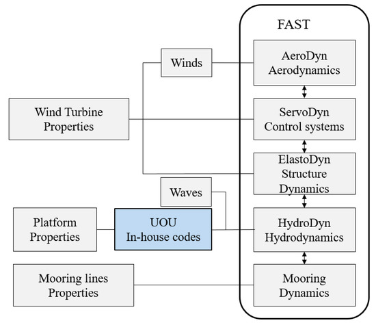 The NREL FAST is able to integrate the fully coupled nonlinear aerodynamic–hydrodynamic-servo-elastic simulation of the FOWT systems in the time domain. The hydrodynamic coefficients of the FOWT are computed by Ulsan University (UOU) in-house code and integrated with FAST to provide hydrodynamic loads of the floating platform. UOU in-house codes are based on potential flow theory to calculate the added mass, radiational wave damping, and the linear and second-order wave loads of floating platforms.