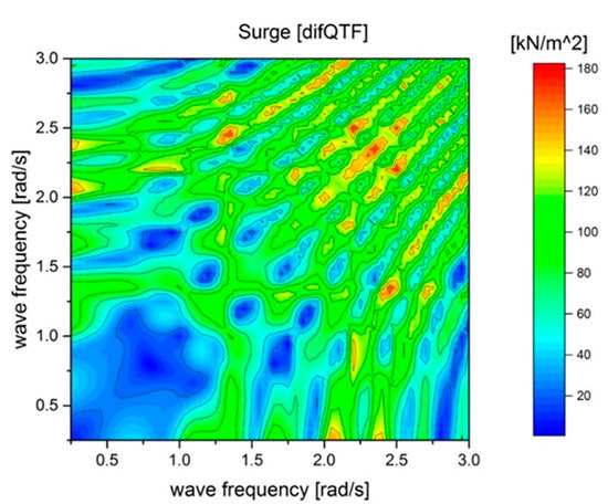 The form of Equations (1) and (2) is similar. The first term represents the fluid pressure acting on the extra wetted surface due to the relative free surface elevation. The second and the third terms account for the velocity squared term in the Bernoulli’s equation and the first order displacement effect in the pressure field, respectively. The fourth term accounts for the rotation of the total first order force or moment of the system. The quadratic transfer function X (ωm, ωk) of the difference-frequency wave excitation can be deduced from the amplitudes of the second order wave forces and moments of Equations (1) and (2). The QTF can be found as the form of Equation (3). They correspond to the incident waves with unit amplitudes and frequencies ωm and ωk and can be divided into four terms, as in Equations (4)–(7).