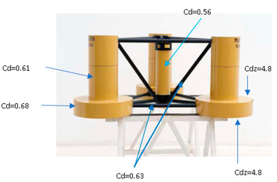 Drag coefficients of OC4 semi-submersible components, where Cd is the drag coefficient in the horizontal direction, and Cdz is the drag coefficient in the vertical direction.
