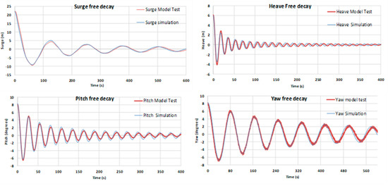 Free decay tests were performed to validate the numerical simulation model by comparing it to the results obtained from the model tests. In the numerical simulation, drag coefficients of the platform were tuned, as presented in Figure 5, and the comparisons between the model test and simulation are shown in Figure 6. By applying different drag coefficients for each component of the platform, damping forces obtained from the simulation were reasonable; thus, the free decay test results in surge, heave, pitch, and yaw of the simulation were in good agreement with those of the model tests.