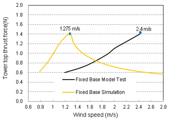 Comparison of the tower top thrust forces between fixed base model test and simulation (results are presented at a model scale ratio).