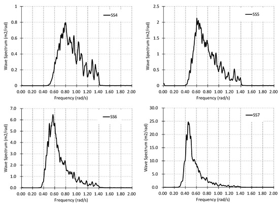 Four irregular wave spectrums generated by the wave maker for model tests (results are presented at a full scale ratio).