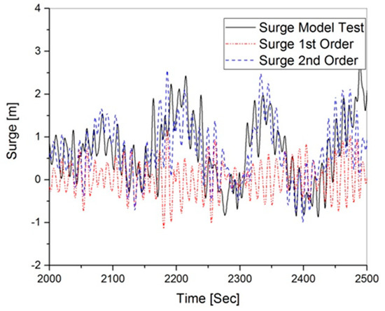 In model tests, irregular waves were generated in 600 s, which equals 5367 s on a full scale. At the same time with generated waves, 6 DOFs of platform motions were captured. The all recorded model test data was scaled up to full scale for analysis. After removing 1000 s in the beginning, the next 3600 s of waves and motions were used for analysis. Figure 9 shows an example of the surge response in time-series for only an irregular wave case. In the figure, the label “1st Order” represents the result of only the first-order hydrodynamic simulation, and “2nd Order” represents the results of the first-order and the second-order hydrodynamic simulation. As can be seen, the global surge response, which was predicted by including the second-order hydrodynamic, was a good match with the model test data, and both were different from the surge response obtained by the only first-order hydrodynamic, significantly.