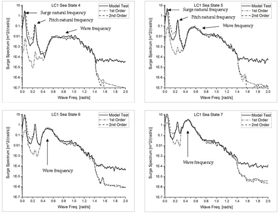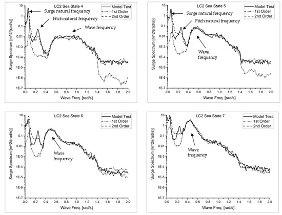 Comparisons of the surge frequency–domain responses are presented in Figure 10 and Figure 11 for the model test data and two different FAST simulations. Two FAST simulations included the simulation with only first-order wave loads and the simulation including first-order and second-order wave loads. Those are the results from four sea states in LC1—only irregular waves, and in LC2—irregular waves with the rated thrust force of the 5 MW wind turbine. In all sea states of LC1 and LC2, surge response spectrums were large at the surge natural frequency. Comparing the test data to the simulation results, it is clear to see that the FAST model that used only the first-order wave force was underestimated at the low-frequency response of the system, and the FAST model including the second-order wave load improved the simulation significantly. The drift motion at the surge natural frequency was due to the resonance response of the FOWT system under the excitation of the second-order wave loads and the thrust force of the wind turbine. Comparing the surge response spectrum between the cases without rated thrust force (LC1) and with rated thrust force (LC2) for each sea state, the peak values were almost similar. This shows that the second-order wave loads were dominant compared to the surge response at the surge natural frequency. The resonance responses were significantly dependent on the applied damping force of the system. In the FAST model, the drag coefficients were assumed to be constant for all sea states; in fact, the drag coefficients may have changed with different sea states, because the drag coefficient was estimated based on the Reynold’s number [27].