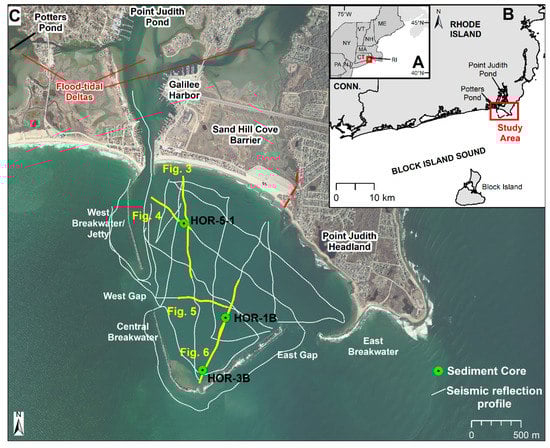 (A) Locus map of southern New England showing the location of the study area. (B) Location of the Point Judith Harbor of Refuge (HoR) relative to the rest of the Rhode Island South Shore. (C) 2014 orthophotograph of the HoR. White lines are the extent of 2016 and 2017 seismic reflection profiles. Yellow lines show the location of the seismic reflection profiles seen in Figures 4–7. Dashed red line shows the approximate boundary between the Sand Hill Cove Barrier and Point Judith Headland. Green circles show the location of sediment cores discussed in the text. Note the sand accumulations within Point Judith Pond and Potters Pond which represent flood-tidal delta deposition.