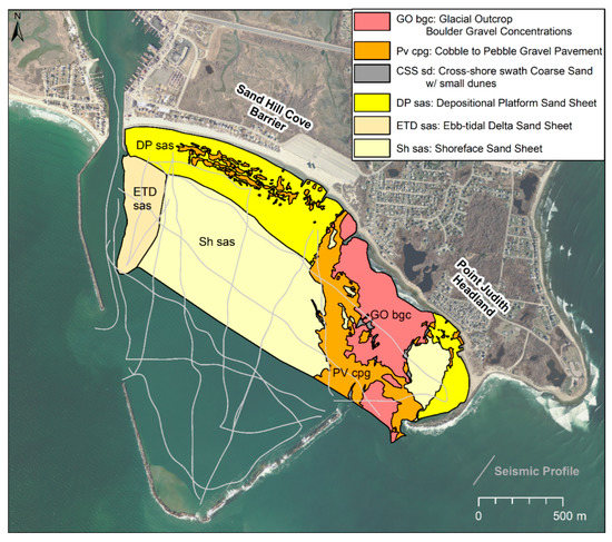 Previous work using oblique aerial photographs, single-beam echosounder-derived bathymetry, and vibracores suggests that Point Judith Pond is a sediment sink, with 1.1 × 104 m3·year−1 of sediment deposited within the flood-tidal delta complex [31]. Approximately 4 × 105 m3 of sediment has been dredged from the main channel and tidal delta complex within Point Judith Pond since 1950 (Michael Walsh, U.S. Army Corps of Engineers, Concord (Massachusetts), USA; pers. comm.). Recent studies focused on the condition of the breakwater’s noted deposition at the apex of the central breakwater (visible in Figure 1), which they attributed to sediment transport via wave transmission through and over the top of the structure [25]. Mapping using side-scan sonar and sediment grab samples showed that the surface geology within the northwestern portion of the HoR is dominated by sand, with cobble to boulder gravel offshore of the Point Judith Headland in the northeastern HoR (Figure 2) [14,35]. Surface sediment samples from the inlet channel and adjacent tidal deltas consist of >90% sand [36].