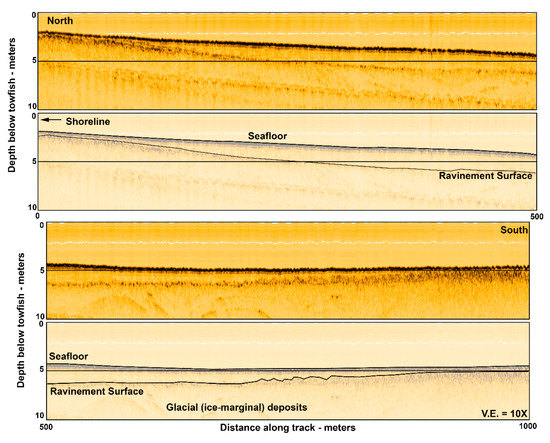 Subsurface interpretations are based on 28 km of sub-bottom seismic reflection profiles (Figure 1) collected in 2016, using an EdgeTech (Wareham, MA, USA), SB-216S Full-Spectrum sub-bottom profiler (frequency sweep 10 kHz). Towfish height was maintained at 1 m below the water surface, towed at < 6.5 km·s−1. Spatial location was embedded into sub-bottom files using the serial output of a Trimble DSM-132 GPS with a reported accuracy of ±1 m. An additional 6 km of profiles were collected in 2017 using a Teledyne Benthos (North Falmouth, MA, USA) CHIRP III sub-bottom profiler (2–7 kHz frequency sweep) powered by a Teledyne Benthos DSP-664 transceiver. The assumed vertical resolution the seismic reflection methods was <15 cm. Profiles were post-processed using Chesapeake Technologies (Mountain View, CA, USA) Sonar Wiz v.6. Processing of seismic profiles was used to adjust for differences in gain and contrast prior to interpretation, and some profiles required a swell filter to remove motion imparted by waves. Depth to reflectors was calculated using an acoustic velocity of 1500 m·s−1. Sonar records were not tide-corrected, which has no effect on the relative measurement (thickness of the sediment between digitized reflectors).