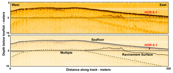 Seismic reflection profile from the northwest corner of the HoR running roughly west to east across a portion of the ebb-tidal delta. Red lines show the location of core HoR-5-1. See Figure 1 for the location of the survey line. Vertical exaggeration is 10×.