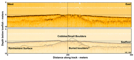 West to east trending seismic reflection profile from the center of the HoR extending across the (now buried) topographic high showing the seismic unit overlying the ravinement surface. Note the presence of cobbles/small boulders visible at the surface and possible buried boulders. See Figure 1 for the location of the survey line. Vertical exaggeration is 10×.