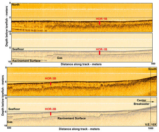 North-northeast to south-southwest trending seismic reflection profile showing the seismic unit overlying the ravinement surface. The seismic profile was collected near the apex of the central breakwater. Red lines show the location and depth of sediment cores HoR-1B and HoR-3B. Note that cores HoR-1-1 and HoR-3-4 were collected in similar locations to HoR-1B and HoR 3-B, respectively. See Figure 1 for the location of the survey line. Vertical exaggeration is 10×; differences in the horizontal scale are due to slight differences in vessel speed during the survey.