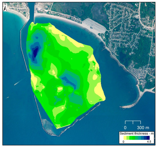 The volume of deposited sediment and the annualized rates are similar between estimates from both the seismic and the historic bathymetric data, and, given the uncertainties in the various methods, the slight differences are likely not substantial. Taken together, the total deposition within the center of the HoR is > 3 × 106 m3 (Table 1). Outside of the seismic survey area, sediment deposition at the apex of the center wall (visible in orthophotographs (Figure 1)) [25] is estimated to be 4 × 105 m3 (average thickness of 7 m according to the historic bathymetric surveys). An estimated 1 × 105 m3 of sediment has also accumulated inside the eastern breakwater and is visible in aerial photographs (Figure 1). Within the HoR, the ebb-tidal delta contains an estimated 7.5 × 105 m3 of sediment (Figure 12). The flood-tidal delta represents an additional 1.4 × 106 m3 according to the annualized rates of deposition [31]. Taken together, these estimates suggest a total sediment volume within the HoR and adjacent Point Judith Pond to be 5.0 × 106 m3. Sediment cores and sediment grab samples ranged from 30% to >90% sand within the central basin. The ebb-tidal delta, as well as the sediment at the apex of the central breakwater and inside the east breakwater, is assumed to be >90% sand. Table 3 summarizes the total sediment volume and estimated sand volume for the deposition sinks within the HoR. The total sand volume reported here (3.6 × 106 m3; annualized rate of deposition 2.9 × 104 m3·year−1) is likely a conservative estimate.