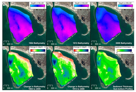 (A). Bathymetry in 1904 (m below 2009 mean lower low water (MLLW)) (B). Bathymetry in 1913 (m below 2009 MLLW) (C). Bathymetry in 2009 (m MLLW). Note that all three panels (A–C) are displayed using the same color ramp, and the shoaling is apparent by the decrease in purple (deeper areas) in 2009 and erosion of the upper shoreface shown by the darker blues in the same period (D). Difference in elevation between 1904 and 2009 bathymetric surfaces (E). Difference in elevation between 1913 and 2009 bathymetric surfaces (F). Sediment thickness interpreted from sub-bottom profiles.
