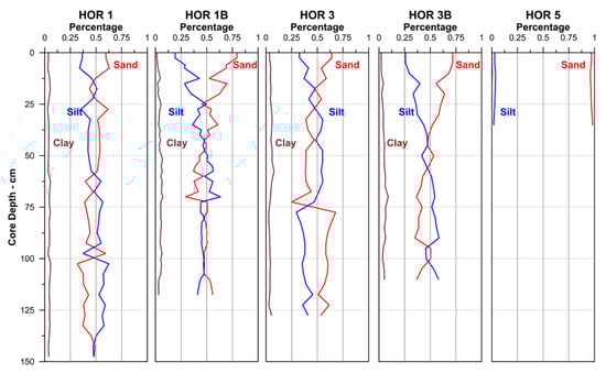 Eleven attempts were made to collect vibracores at five locations within the HoR in May 2018. Minimal penetration was achieved and/or no recovery occurred at four locations; five recovered cores were <0.6 m. Two vibracores exceeded 1 m. The results of the coring attempts are summarized in Table 2. Three vibracores (HoR 1-1, HoR 3-4, and HoR 5-1) were selected for grainsize analysis. Two additional cores collected using the polycarbonate piston corer in November 2019 were recovered in the same general locations (HoR-1B (recovered length 1.15 m) and HoR-3B (recovered length 1.2 m)) for isotopic analysis of 210Pb and 137Cs. The positions of HoR-1B and HoR-3B are shown in Figure 1; HoR-1-1 and HOR3-4 were collected within 100 m of these locations and are not shown. Sediment texture results of the five cores are shown below. Cores HoR-1, HoR-1B, HoR-3, and HoR-3B demonstrate a general coarsening upward over the upper 0.25 m, ranging from sandy silt to silty sand on the basis of the Shepard [55] classification system (Figure 9). A surface sediment sample collected 125 m west of core HoR-1B by the US Geological Survey (Sample NBIS70, [56]) (77% sand, 22% silt and 1% clay) is nearly identical to the surface sample of HoR-1B (79% sand, 19% silt, 1.5% clay). The four cores collected in the central basin of the HoR averaged 50% sand (predominately fine to very fine sand), although this varied downcore from 25% to 79% sand. Core HoR-5-1, taken on the shoreface within the northern parts of the HoR, was largely sand. The inlet channel and adjacent ebb-tidal delta is composed of >90% sand [36].
