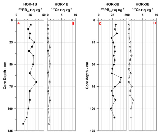Constant flux-constant sedimentation (CFCS) model showing (A) excess 210Pb and (B) total 137Cs (Bq·kg−1) for core HoR-1B, as well as (C) excess 210Pb and (D) total 137Cs (Bq·kg−1) for core HoR-3B. See core location in Figure 1. The full results of the analysis are available in (Table S6 Supplementary Materials).
