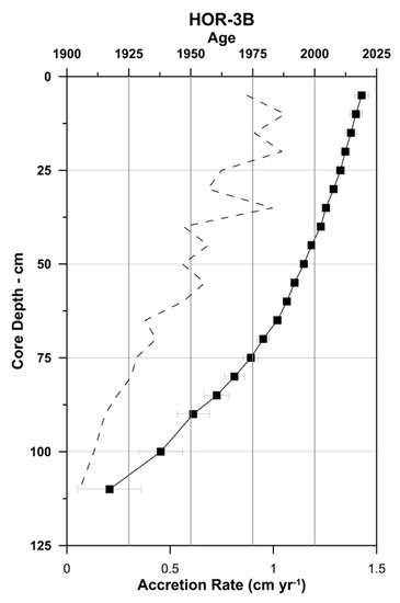 The CFCS 210Pb model was applied to the measured concentrations in cores HoR-1B and HoR 3B. Concentrations of excess 210Pb ranged between 25 and 40 Bq·kg−1, except the base of HoR-1B, which decreased to 12.5 Bq·kg−1 at 1.2 m (Figure 10). Average accretion rates were calculated as the slope of a best-fit linear regression line of the natural log of excess 210Pb [49]. The resulting best-fit lines showed relatively poor fits (HoR-1B, 2.3 cm·year−1, R2 = 0.25; HoR-3B, 0.78 cm·year−1, R2 = 0.02). The poor fit of these lines suggests that the accretion rate varied downcore and makes any age-depth model suspect; however, applying these values places the base of the cores at AD 1967 (HoR-1B) and 1878 (HoR-3B). The 137CS results are not robust for both cores, given the relatively low concentrations of 137Cs (< Bq·kg−1); however, assuming a small spike in 137Cs at a depth of 0.4 m in HoR-3B represents the peak of atmospheric testing in AD 1963, the sedimentation rate would be ~0.7 cm·year−1, similar to the calculated sedimentation rate. A second peak in 137Cs at 0.9 m complicates this interpretation and could place the accretion rate as high as 1.6 cm·year−1. There is no discernable peak in the 137Cs measurements observed in HoR-1B. The CRS Accretion Model was applied to HoR 3-B, placing the age at the base of the core at 1917, with an average sedimentation rate 0.57 cm·year−1 (accretion rate ranged from 1.10 to 0.06 cm·year−1) similar to the CFCS rate of 0.78 cm·year−1 (Figure 11).