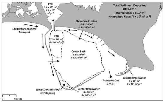 The use of armoring to protect coastal properties from storm impact, erosion, and sea-level rise has increased markedly since 1900 [1]. Recent estimates are that 14% of the continual United States (US) shoreline has been armored, and that number could double by 2100 [1]. Shoreline protection structures alter the physical characteristics of a shoreline, affect sediment transport pathways, and can negatively impact the fronting beach and adjacent shorelines, both physically and ecologically [2,3,4,5,6]. Understanding the natural and anthropogenically influenced coastal sediment transport rates and pathways is a critical part of managing the shoreline behavior in a time of rising sea level [7] and the potential for increased storminess [8,9]. Breakwaters, either detached or shore-connected, are common shoreline protection structures, designed to reduce wave energy, providing a safe harbor and some protection of the shorelines and vessels behind the breakwater [2]. Sediment deposition behind these structures is expected as the incoming wave energy is reduced [10], and the volume of newly deposited sediment provides an estimate of the rate and direction of sediment transport, which is key to assessing the sediment budget in coastal systems. Sediment budgets remain one of the most useful concepts in coastal research and science-based coastal management [10] and can be used to quantify the volume of sediment sources, sinks, and alongshore and cross-shore transport pathways for a given coastal segment [11]. Sediment budgets are typically based on the volume(s) of sediment that are the most well constrained within a system, and unknown or lesser known values can be approximated [12].
